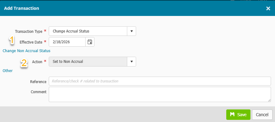 - Change Non Accrual Status enables the payment account to be on non accrual. You can report and filter reports based on this status in the Payments reports. The only way to reverse non accrual status is to delete out the transaction.