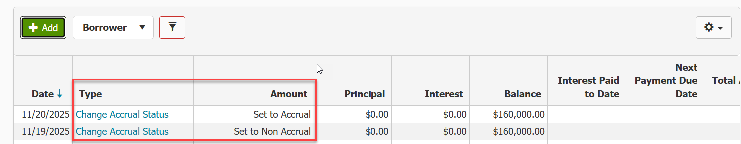 - Lenders can now change their payment accounts status from Non Accrual to Accrual without removing any previously posted transactions. Previously, lenders had to remove the original transaction of Non Accrual status in order to remove the Non Accrual flag. This transaction does not perform any Non Accrual/Back to Accrual calculations, it is only an informational status.