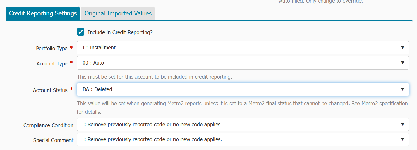 - In Credit Reporting Settings tab, change Account Status to DA or DF depending on the situation (refer to credit reporting guidelines for more information on when to use DA and DF statuses)