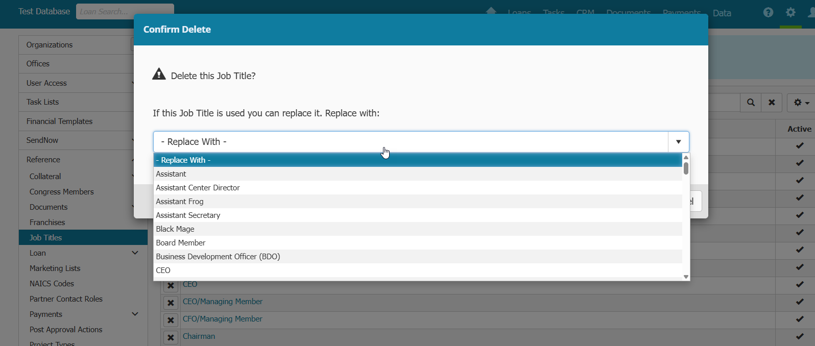 2. Lenders can "clean up" their Ventures job titles in Administration > Reference > Job Titles menu by using the new "Replace" feature. Simply click on the X of the job title record you want to remove and select the job title you want to replace with so any records using that title will be substituted.