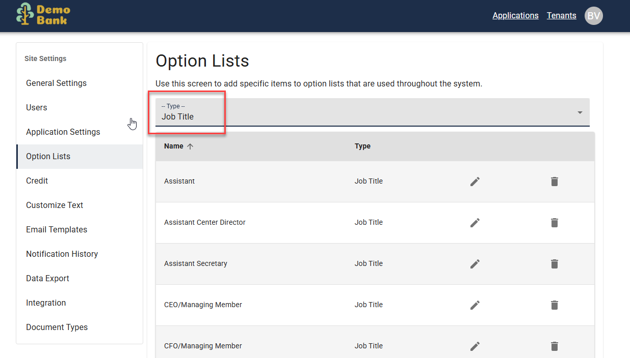 1. The Job Title field in Gateway's ownership grid is now administered by the Lender in the Gateway > Site Settings > "Option Lists" menu. Lenders will find a default list provided and can add or remove what they need to. If they add a job title that does not exist on their Ventures site, then a job title would be created in the Administration > Reference > Job Titles menu.